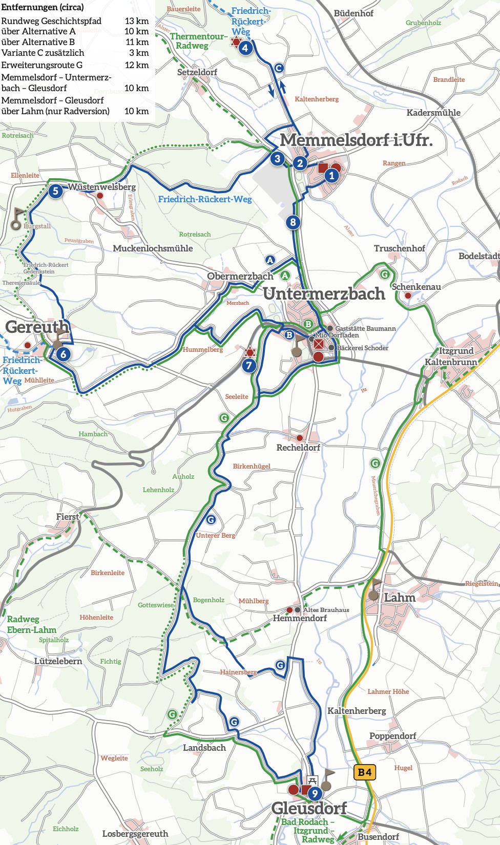 Informationen zu den verschiedenen Varianten, zu Entfernungen und Wegbeschaffenheit finden Sie hier und auf der Seite der Initiative Rodachtal "Spuren jüdischer Geschichte an de Rodachmündung" - nördlicher und südlicher Weg und die Radversion.
