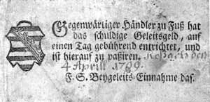 Quittung für Geleitgeld, Rossach 1789, Genisa Synagoge MemmelsdorfSeit den Karolingern standen Juden unter dem alleinigen Schutz des Herrschers, der ihnen die Sicherheit von Person, Eigentum und Religion garantierte. Mit der Zeit wurden die Schutzrechte auch an Reichsritter oder Städte vergeben. Diese gewährten mit so genannten Schutzbriefen an einzelne Juden oder jüdische Gemeinden ein zeitlich befristetes Niederlassungsrecht, teilweise auch mit Handelslizenz. Der Schutzbrief galt für den Inhaber, seine Familie und seine Bediensteten. Als Gegenleistung wurden die Zahlung eines jährlichen Schutzgeldes und weitere Abgaben zu bestimmten Anlässen gefordert. Beim Tod des Inhabers ging der Schutz auf die Witwe über, mündige Kinder benötigten einen neuen Schutzbrief. Starb der Schutzherr, waren die Briefe in der Regel ungültig und wurden von den neuen Territorialherren nicht immer erneuert. "Schutzjuden" wurden eine wichtige Einnahmequelle, vor allem nach der Verwüstung vieler Gebiete im 30jährigen Krieg. Kleinere Territorialherren konnten mit der Ansiedlung von Juden ihre politische Unabhängigkeit unter Beweis stellen, zum Beispiel gegenüber größeren Städten oder Bistümern, auf deren Gebiet Juden weiterhin unerwünscht waren.