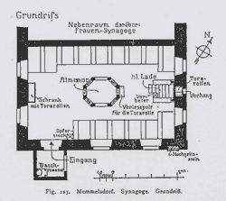 An der Nordseite des Hauptraumes wurden zwei weitere Räume untergebracht: im Erdgeschoss eine Wohnung für den jüdischen Lehrer, darüber die Frauenempore, deren große, mit hölzernen Ziergittern verdeckte Fenster einen Blick in den Betraum gewährten. Vor dem Haupteingang an der Südseite befand sich ursprünglich ein Vorbau, von dem aus man in den Hauptraum hinunter stieg.